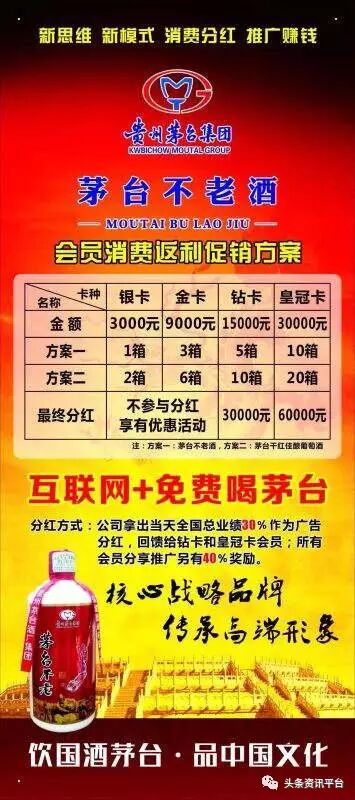 一次性购买不同金额的茅台系列产品,可成为公司会员,在免费喝茅台的同时,推广事业,会得到更多的福利!银卡3000元、金卡9000元、钻卡15000元、皇冠卡30000元、奖金日结日发;