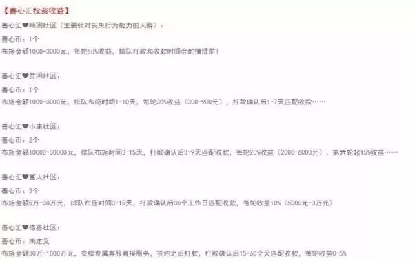 只要每年向公司缴纳300元年费,就可以在善心汇众扶互生大系统注册一个会员账号,激活账号后就可以选择投资方式。在该系统中,打款行为称之为“布施”,收款行为叫“受助”。收益规则如下:每次布施前需购买善心币,价格为100元/个。