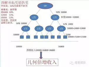 二、开拓奖(50%无限层):也就是我们所说的层奖,我们就拿20000的举例说明:你左边一个20000、右边一个20000,这时1:1拿50%,也就是10000,那么你介绍的人再介绍2个20000的会员又是一层,虽然不是你直接推荐的,但是对于你来说又多了一层,又是10000、当然,如果说一个2000和一个20000的对碰就是1000块钱,按小的50%计算。那你就亏了9000,所以说,自己投资什么级别就尽量找和你自己一样级别的会员,这就叫开拓奖.(此项奖金不封顶)