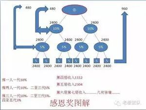 四、感恩奖:当你介绍1个人、你就拿介绍这个人第一代的10%,介绍2个、拿第一代收入的10%,第二至三代收入的5%,当你介绍3个人时,拿第一代收入的10%、第二至三代的5%、四至五代的3%、那么5代有多少人呢?你直接介绍三个是你的第一代,这三个人每个介绍三个即:9个人,就是你的第二代,他们每个再介绍三个都可以拿到五代的时候是多少人?27个,第四代就是81个,三三复制,到第五代是多少呢?243人,总共加在一起就是363人,363人按照二八定律,就70人每人每天给你10块是多少?700块,那要是给你100呢?就是7000块,万一给你1000呢?咱这是推荐三个就300多人,那么咱用三年的时间推荐10个人应该是没问题的,甚至更多,三年的时间推荐10人,那么第二代多少?100,第三代1000,第四代10000,第五代100000,所以说咱的感恩奖是不封顶的