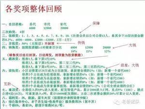 五、荣衔奖:那么荣衔奖怎么拿?大家都知道双轨制最难解决的是什么?就是大象腿的问题,大家想一下,你大区做了几千万,小市场做做了几十万,是不是大部分都是一比一?算一下这样的业绩你才能拿多少钱?全部沉淀到公司了,那么今天辅仁药业荣衔奖就是给你解决大象腿的问题,当你小区业绩累计20万为主任,拿其伞下新增业绩的2%,大家算一下,20000就给你400,10个呢?100个呢?那小市场不见业绩怎么办?如果你大市场有10万,你照样能拿2%,这样的话就解决了大象腿的问题,你左边培养一个主任,右边培养一个主任你就是经理,拿新增业绩的3%,培养两个经理就是总监,拿4%,培养两个总监叫总裁拿新增业绩的6%,左右区加一块培养三个总裁为董事拿6%另外2%的全公司业绩加权分成,那么2%-6%是你个人伞下的营业额,当然平级的就没有了,所以说这项奖金就是级差奖,假如说你是总裁或者董事,你拿6%,你又介绍一个20000的,荣衔奖就是1200,开拓奖和销售奖你还照样拿。你介绍的越多你拿的钱就越多。荣衔奖就是解决一个偏区的问题。