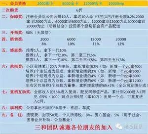 三、销售奖(量碰):那么这项奖金怎么算呢?是根据你投资的级别不同,两个市场以小市场新增业绩的提成比计算而得,2000是8%、6000是10%、12000是11%、20000是12%、拿20000举例:如果你小市场有10万,那么10万的12%也就是12000,加上上个奖项的开拓奖就是你的收入,销售奖有一个日封顶,2000日封顶2000、6000日封顶6000、12000日封顶是12000、20000日封顶是20000。